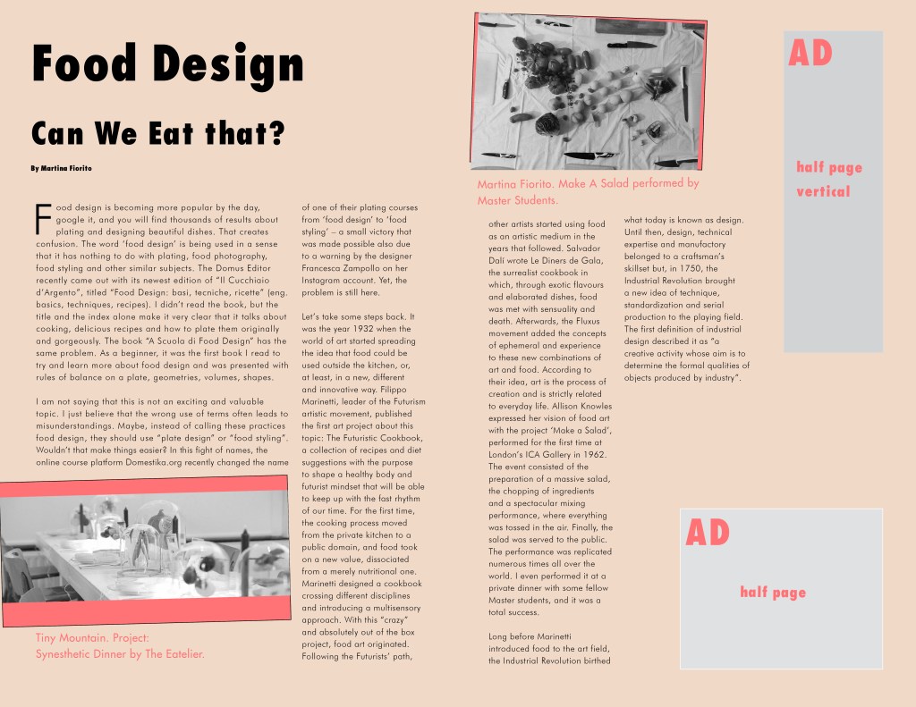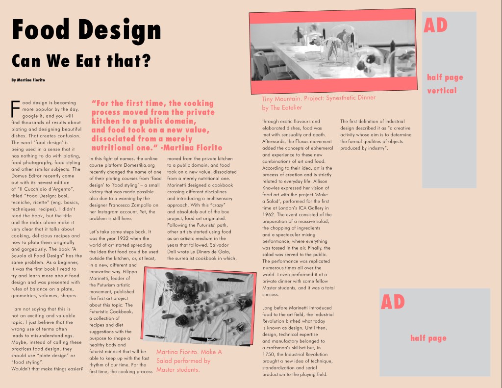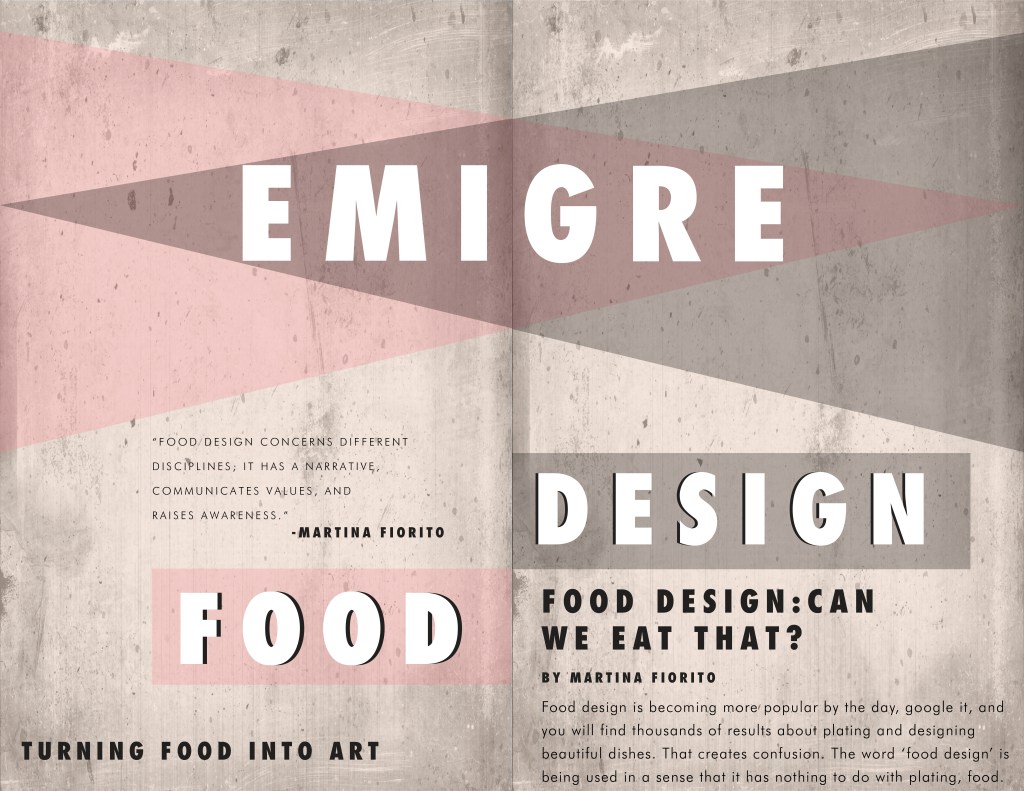 Redesigned magazine article from the magazine “Emigre” featuring the sub article of food design.