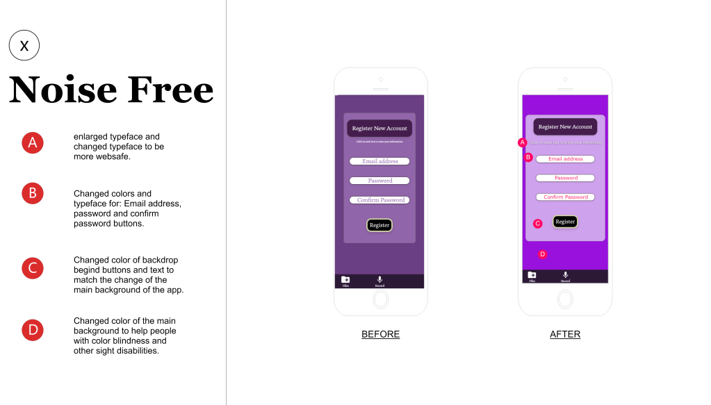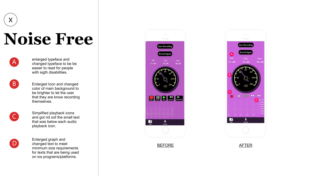 When looking back at the first app I created in Interactive Media, I noticed that a lot of the text and colors I used might be hard for people with sight issues/disabilities to read. To solve this issue I redesigned the fonts, colors, Icons, etc. and changed it to make it more accessible for all users that will be using the app.