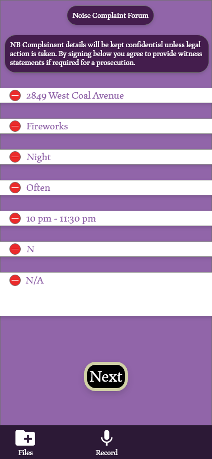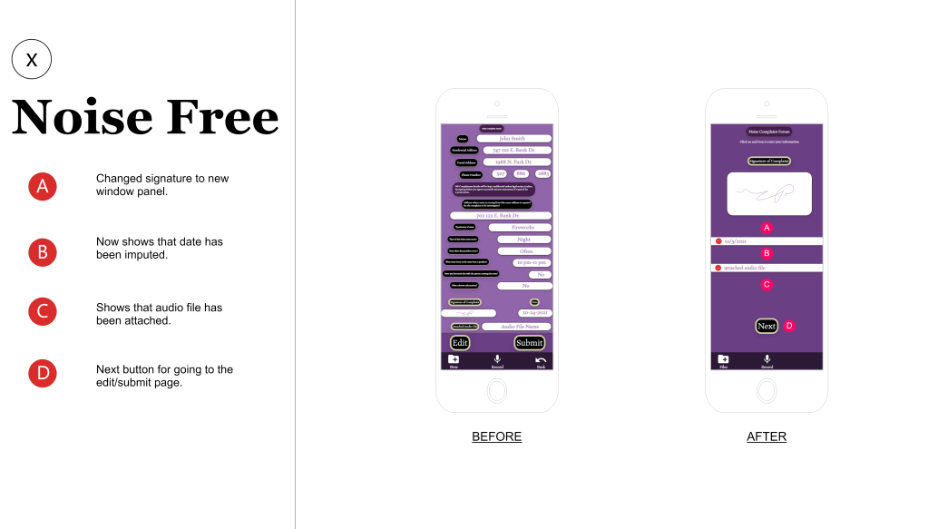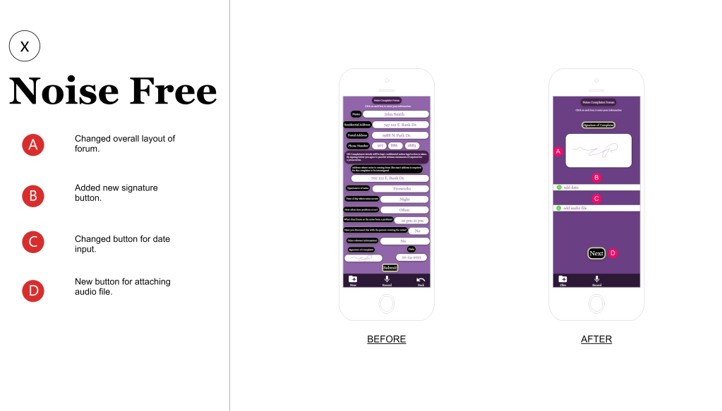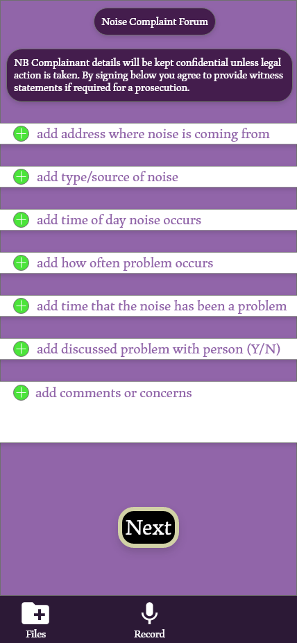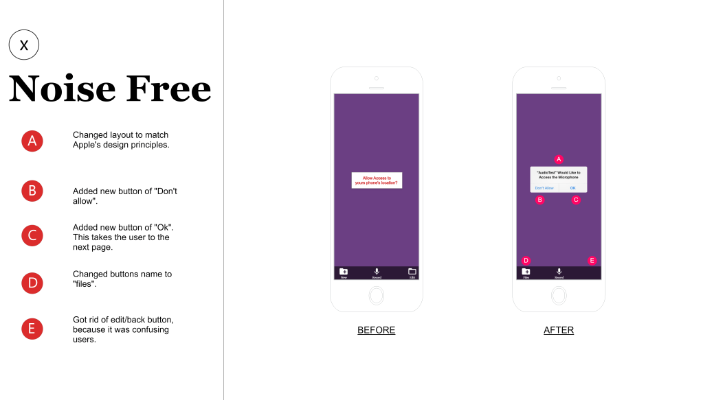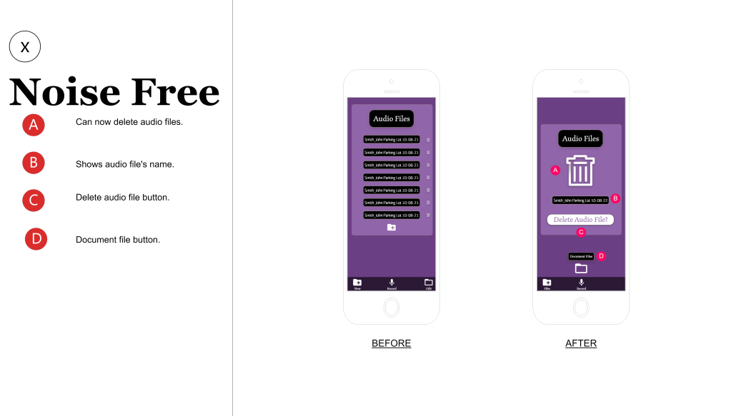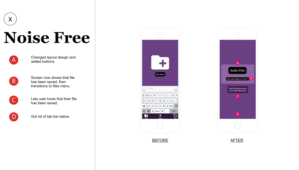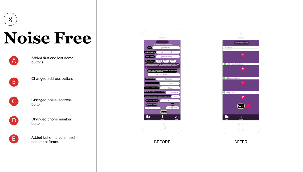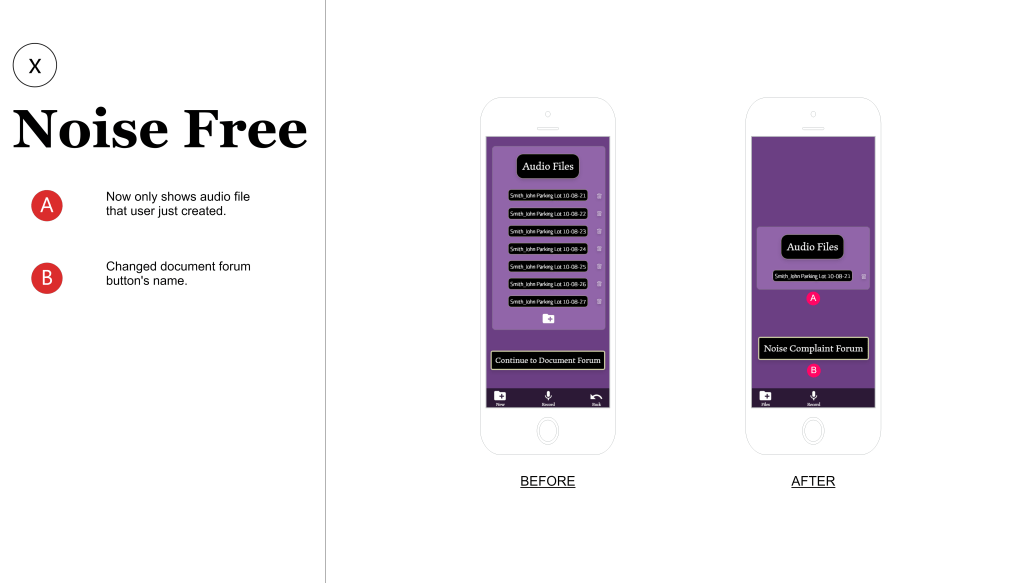 Using participants from the ages of 45-65, I let these participants use the Noise Free “prototype” to see how they handled the application. I asked the participants to try and navigate the application to: record audio, save the file, Create a new document, attach the audio file and submit the application. Most of the participants were able to complete these tasks within 3 minutes and submit the final forum.